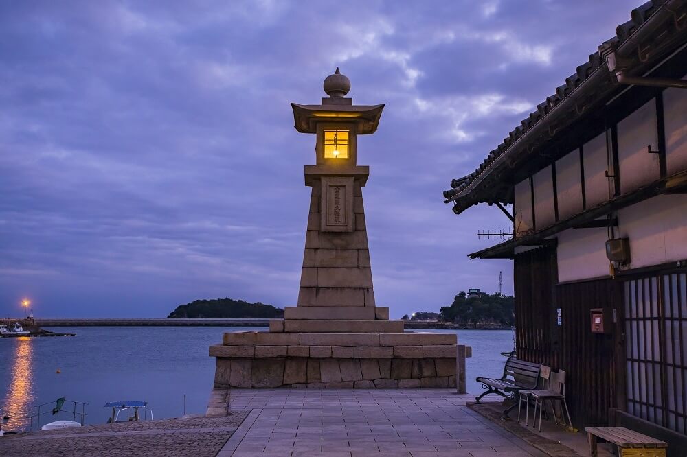 地元では「燈籠塔」と呼ばれ親しまれており、「雁木」と呼ばれる潮の干満に関わらず荷揚げができる階段状の船着場の先端にそびえ立っています。