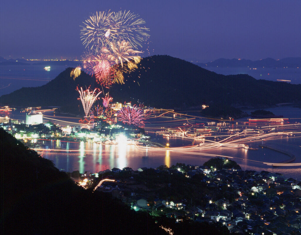 最大の特徴は、鞆の浦のシンボルである沖合の弁天島から花火が打ち上げられる点です。ライトアップされた弁天島と夜空を彩る花火、そして波穏やかな海面に花火が反射する幻想的な「逆さ花火」は、他では味わえない美しさです。