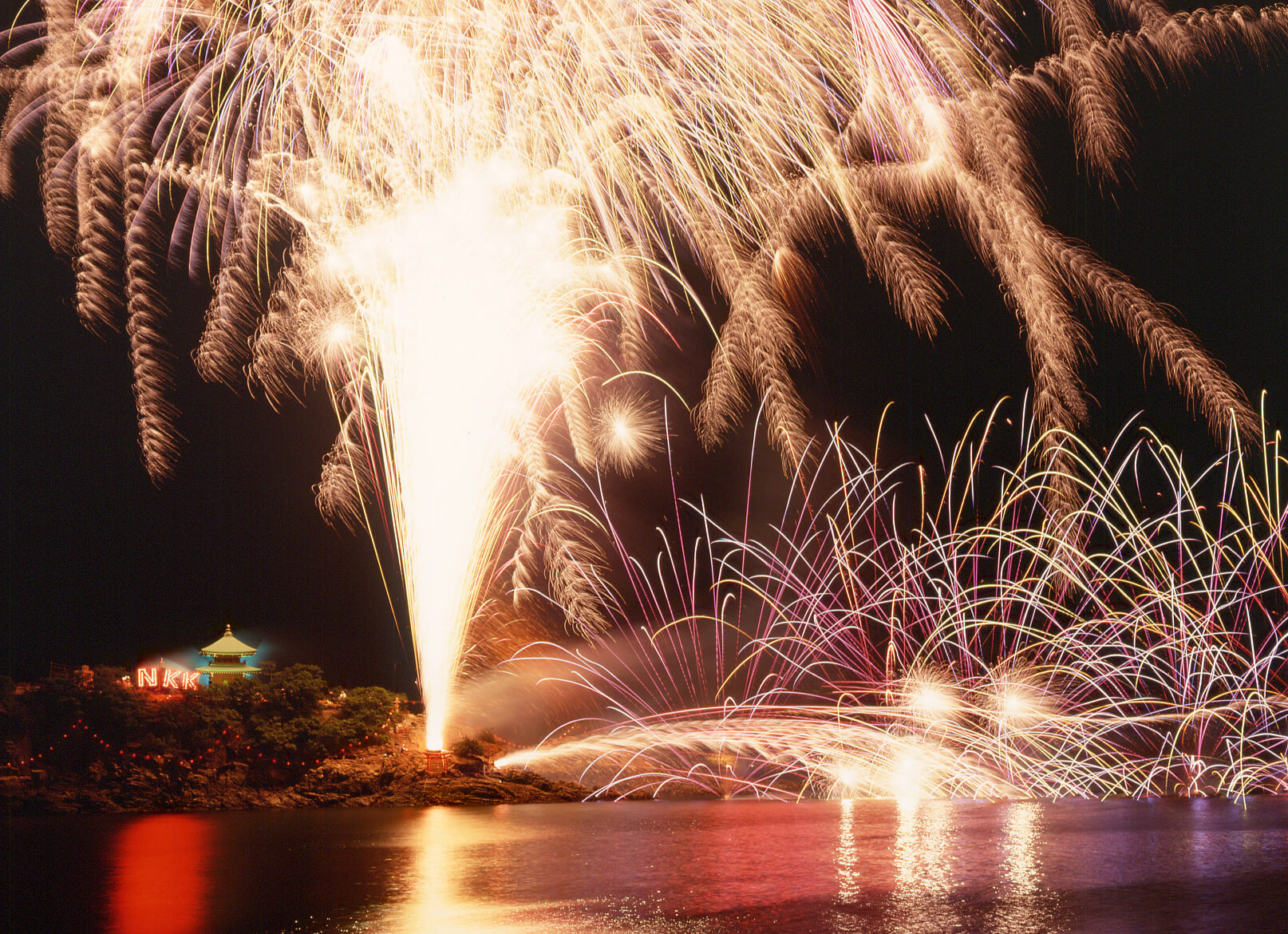 見どころ② 海に浮かぶ「弁天島」からの打ち上げと「逆さ花火」
